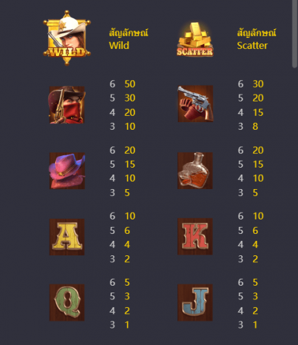 คาวบอย หากสะสมได้ 3, 4, 5, 6 อัน จะได้รับอัตราการจ่ายตามลำดับ 10, 20, 30, 50