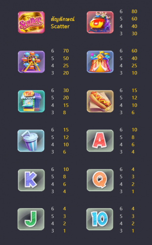 ชิงช้าสวรรค์ หากสะสมได้ 3, 4, 5, 6 อัน จะได้รับอัตราการจ่ายตามลำดับ 20, 25, 50, 70